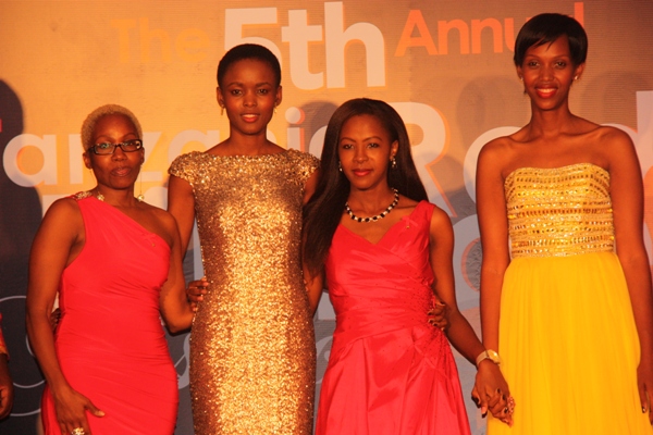 MC Evance Bukuku akinadi gauni lililovaliwa na Mwanamitindo Jennifer Bash lililobuniwa na Sherri Hill.